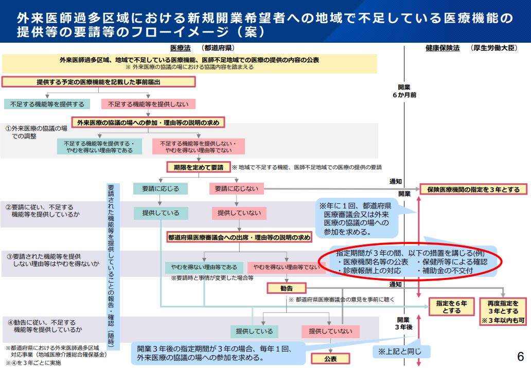 2つめのポイントが、「外来医師過多区域」における無床診療所への対応の強化です。具体的には、新規開設の6か月前までの届出を求め、地域で不足する医療や医師不足地域での医療の提供の要請を可能とすること、要請に従わない場合は勧告・公表すること、場合によっては保険医療機関の指定期間を短縮することが考えられています。